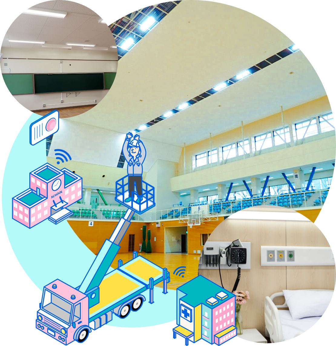 照明、コンセント、防犯カメラ、スピーカー、火災報知器を使えるようにするための配線工事をはじめ、医療機器の電源工事やインターネット回線の通信設備工事にも対応。公共施設は自治体によって施工方法が異なり、各自治体の施工方法に則って施工を行っています。