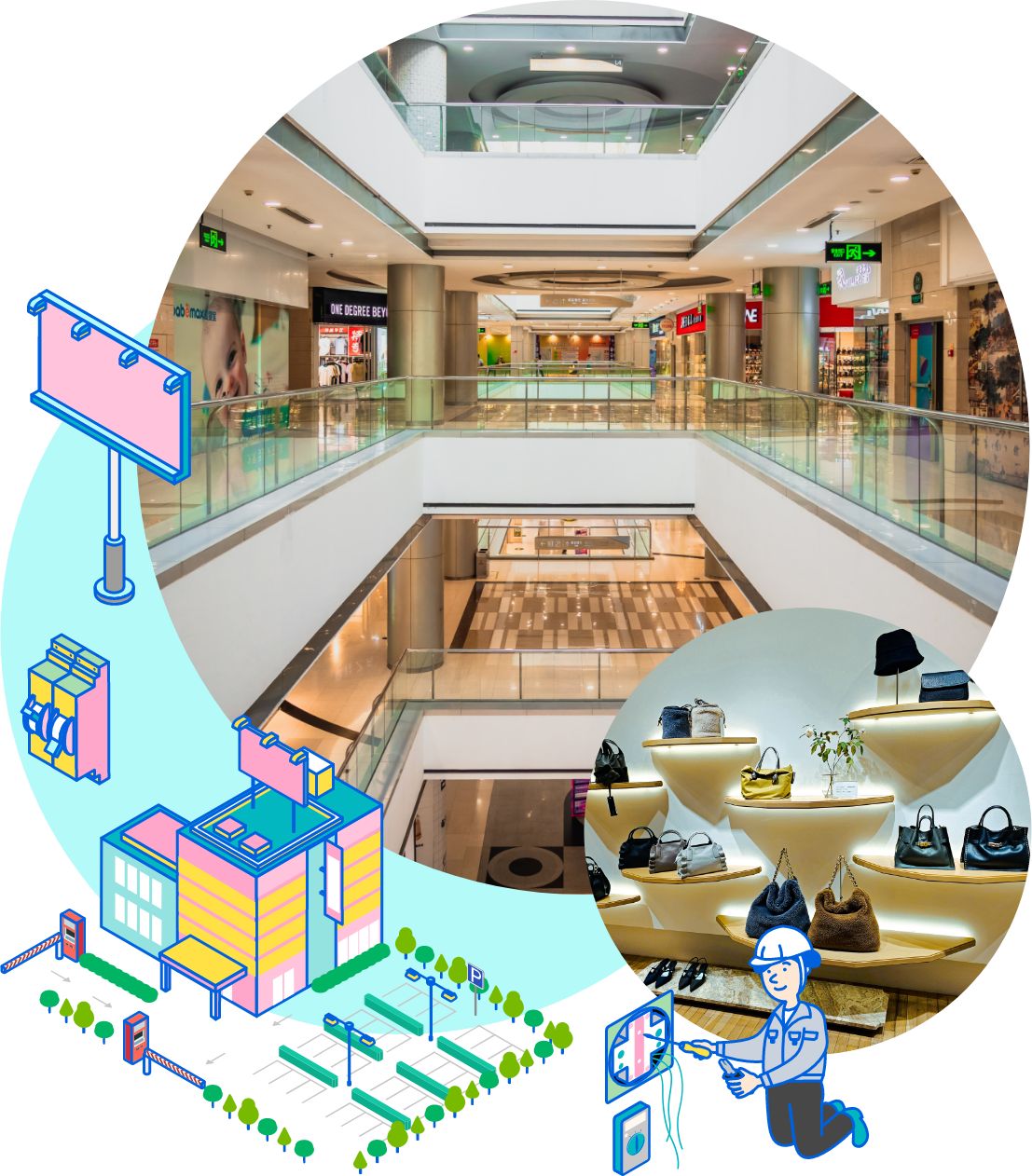 ショッピングモールを中心とする大型商業施設の電気設備工事を行っています。照明をはじめ、駐車場のパーキングゲートや店舗ディスプレイ、屋外看板など、電気工事を通じて商業施設内のあらゆる機器・設備に電気を供給しています。