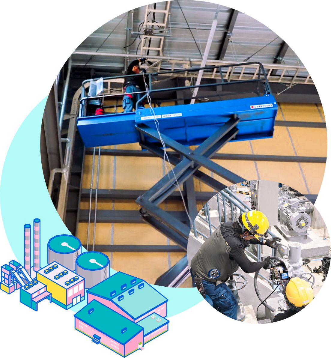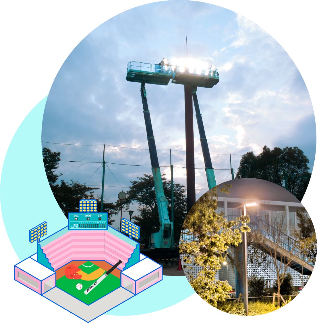 名古屋市内の公園や野球場など、屋外施設の電気設備工事を行っています。高圧電力を低圧電力に変圧する電気室の工事や屋外照明のLDE化、ナイター照明設備工事など、高所作業車を用いる高所作業にも対応しています。