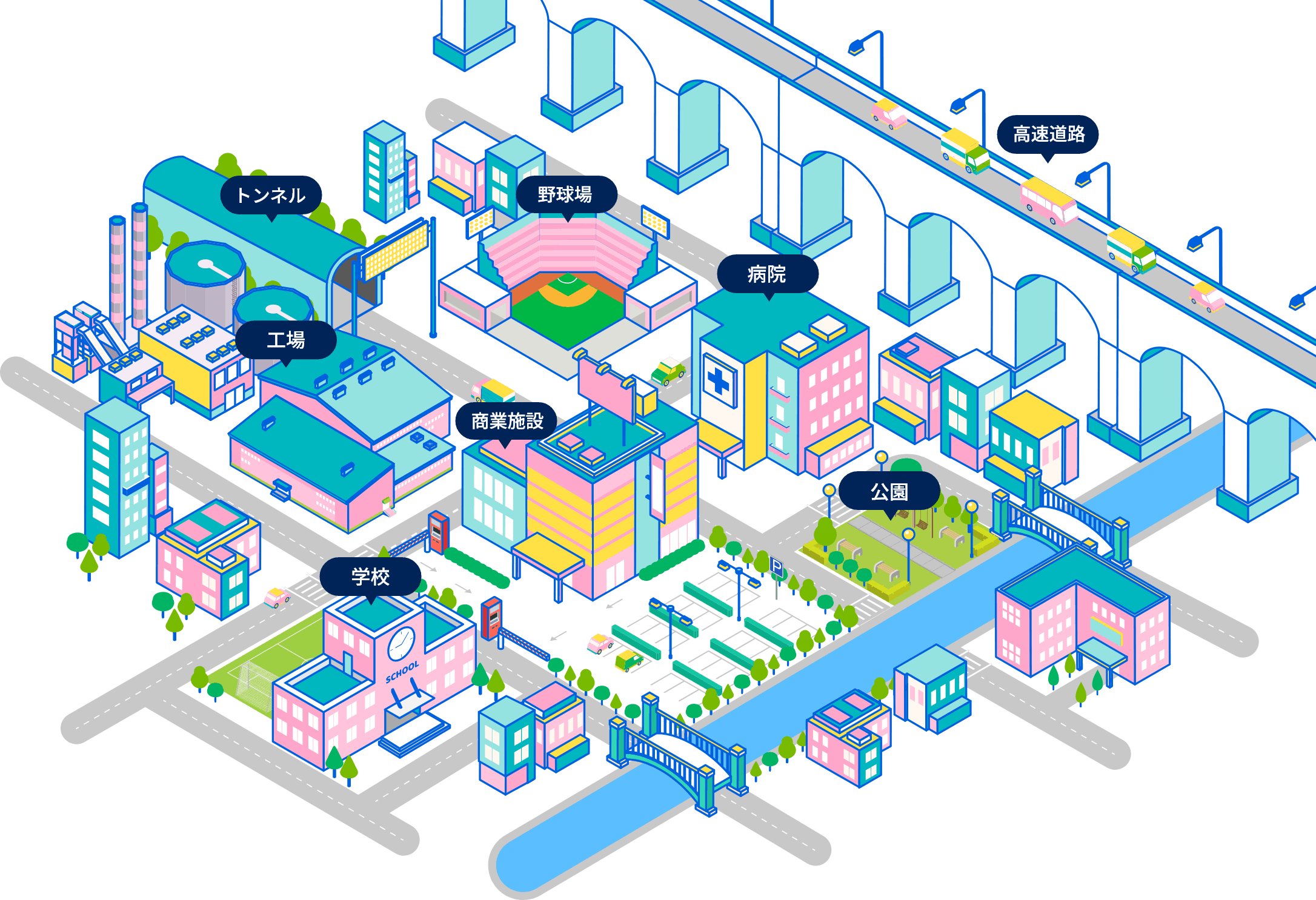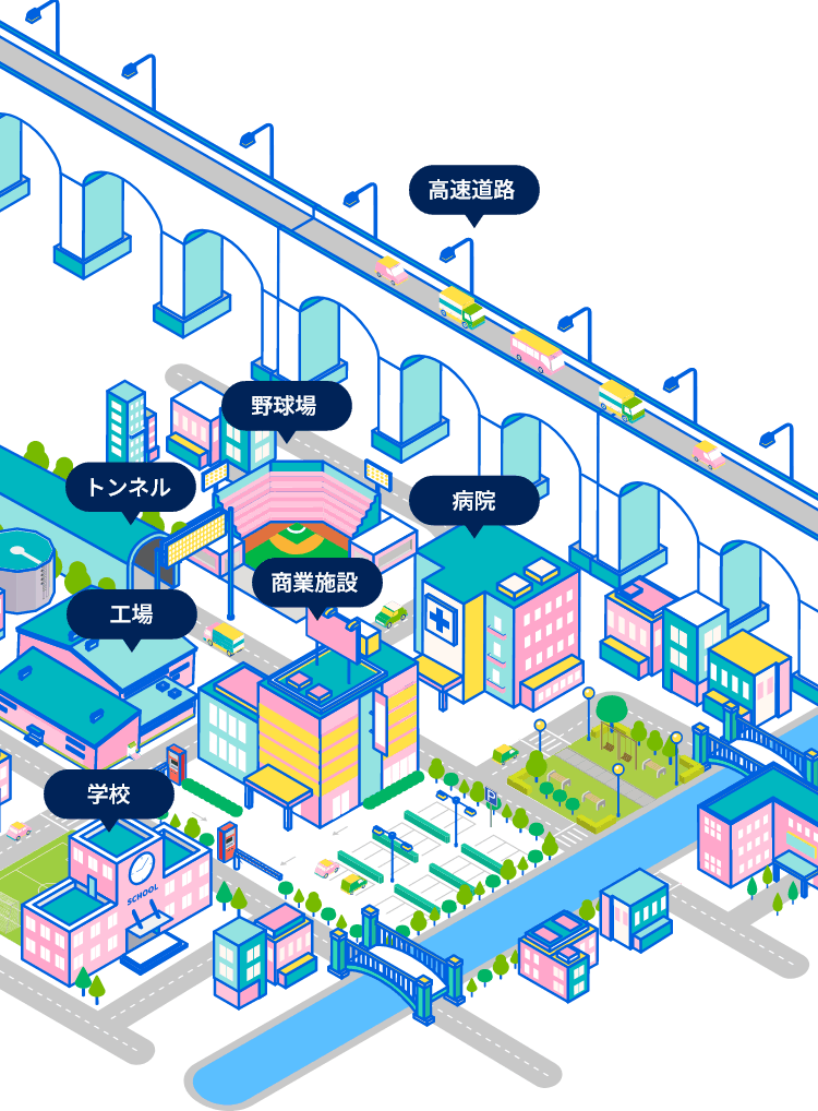 病院、学校、工場、ショッピングモール、地下鉄、公園、高速道路など、